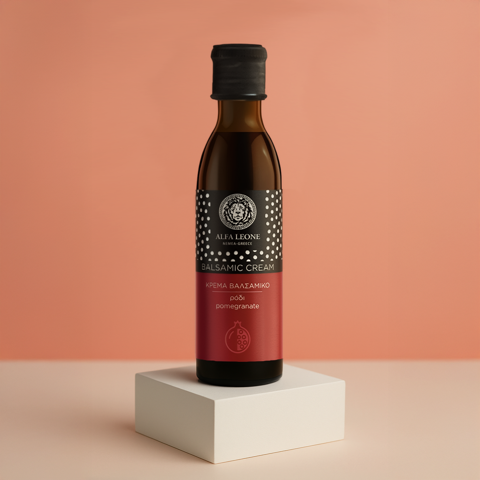 Die Alfa Leone Balsamico-Creme Granatapfel verbindet die samtige Süße von Balsamico mit der aromatisch-frischen Note reifer Granatäpfel. Durch den Zusatz von frischem, natürlichem Granatapfelsaft entsteht ein intensives Aroma mit feiner Fruchtsäure – ideal zum Glasieren, Garnieren und Abrunden mediterraner Gerichte, Bowls und Desserts.
