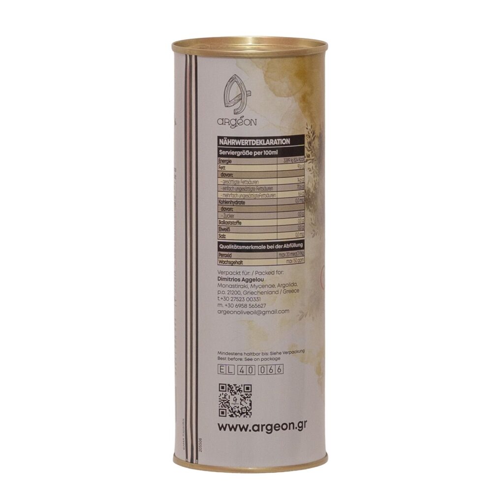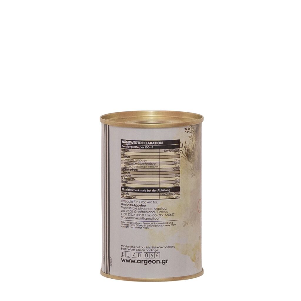 Argeon natives Olivenöl extra (5L) stammt aus der Ebene von Mykene/Argos, wo seit der Antike Oliven kultiviert werden – überwiegend aus der Koroneiki-Olive, in Familienhand angebaut und nach strengen Standards verarbeitet. Erste Güteklasse – direkt aus Oliven, ausschließlich mit mechanischen Verfahren gewonnen: fruchtig, reich an Nährwert und ein fester Bestandteil der mediterranen Küche. Die ergiebige 5-Liter-Vorratsgröße ist ideal für Salate, Marinaden sowie Kochen & Backen – perfekt für Haushalt und Gastronomie.