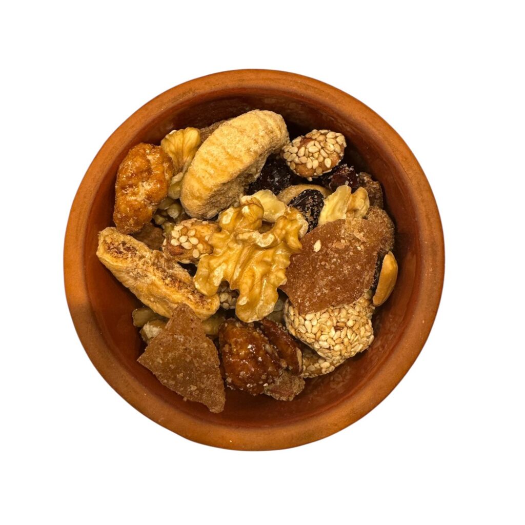 Enthält: Erdnüsse, Gewürze, Kräuter, Schalenfrüchten (Nüsse), Sesam, Trockenfrüchte